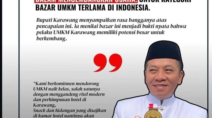 Dan Pemerintah Kabupaten Karawang, Jawa Barat, berhasil memecahkan rekor Museum Rekor Dunia Indonesia (MURI) sebagai penyelenggara Bazar UMKM Terlama. Pencapaian ini diraih berkat penyelenggaraan bazar yang berlangsung selama 14 hari penuh, jauh lebih lama dari durasi bazar pada umumnya yang hanya sekitar tiga hari. (Wiwi)